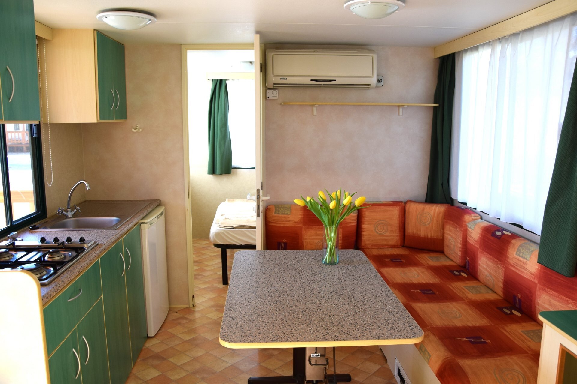 Das Mobilheim bietet alles, was man von einem Appartement erwarten kann: Badezimmer mit Dusche und WC, Küche mit Kühlschrank, Gasherd und alles was eine Küche benötigt (Töpfe, Besteck und Küchengeschirr für 6 Personen, sowie Mikrowelle und Wasserkocher)