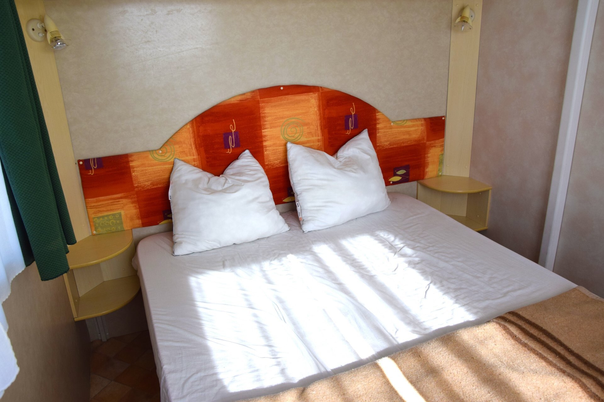 Das Mobilheim bietet bequem Platz für 5 Erwachsene und ein Kind. Ein Zimmer ist mit einem Doppelbett, das andere mit 3 Einzelbetten (Etagenbett oder Wandbett) ausgestattet. Für einen 6. Gast steht im Wohnbereich eine ausziehbare Couch zur Verfügung.