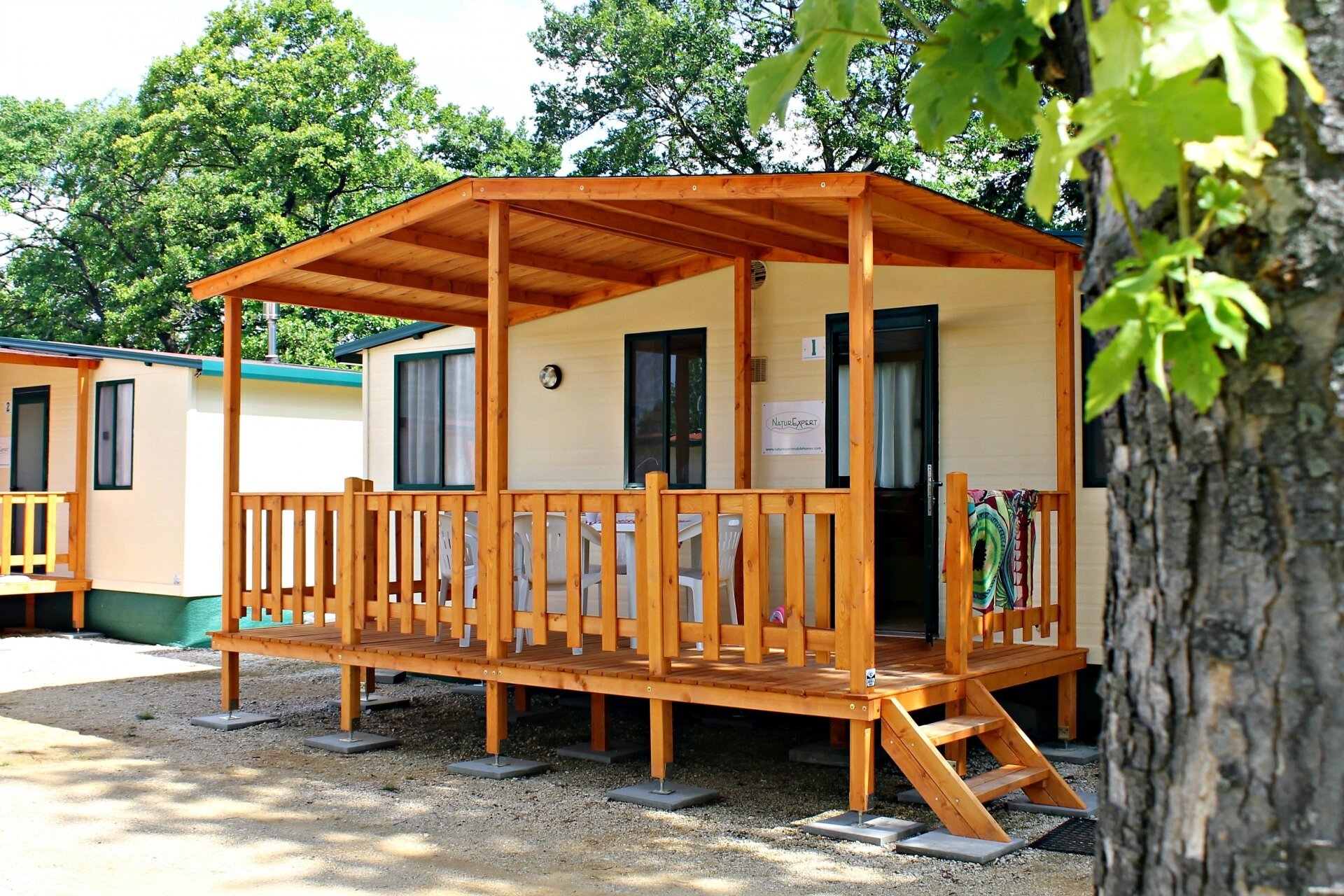 Zu jedem Mobilheim gehört eine Terrasse mit Plastik Gartenmöbeln für 6 Personen und 2 Liegestühle direkt neben dem Haus.