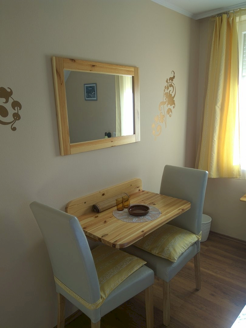Das Appartement im Erdgeschoss hat zwei Zimmer (für 2-4/+1 Person), beide Zimmer haben je einen separaten Ausgang auf die Terrasse, auf welcher sich ein Esstisch mit vier Stühlen befindet. Der Wohnteil verfügt über eine Küche, welche wir mit grundlegenden Kocheinrichtungen und Geschirr für vier Personen ausgerüstet haben. Ein Gasherd, Kühlschrank, sowie eine Kaffeemaschine stehen Ihnen zur Verfügung. Im Erdgeschoss gibt es auch ein Bad. Das Appartement im ersten Stock bietet Unterkunftsmöglichkeit für 2-8 Personen und verfügt über drei Badezimmer. Das zu den Zimmern im ersten Stock gehörende Wohnzimmer und Speisezimmer befindet sich im Erdgeschoss, genauso wie die Küche, welche sich in einem Raum mit diesen befindet und welche wir für acht Personen ausgerüstet haben. Eine Mikrowelle und eine Kaffeemaschine, ein Kühlschrank sowie Töpfe und alle zum Kochen benötigten grundlegenden Kücheneinrichtungen sind in der Küche zu finden. Geschlossener Parkplatz, Grillplatz und Fahrradbenutzung.